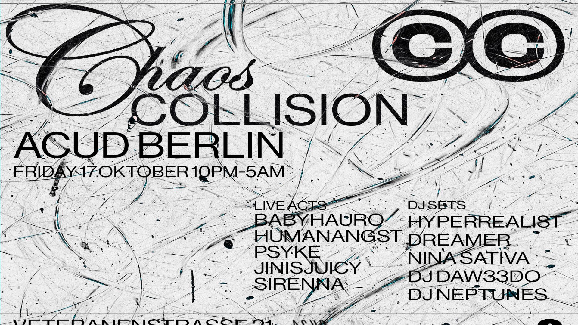 CHAOS COLLISION bringt am 17. Oktober eine Nacht, in der Live Acts, unter anderem des Germanistan-Kollektivs, und energiegeladene DJ-Sets auf die Bühne treten. Zwischen Experimental Trap, Hyperpop und experimentellen Club-Sounds entsteht ein Spannungsfeld, das sich ständig neu auflädt. DJs ergänzen die Energie mit Hoodtrap, Bass, Techno – ein Abend voller Kontraste und unerwarteter Übergänge. Einlass ab 22:00 Uhr – seid dabei, wenn Welten von Sound und Vibe kollidieren.