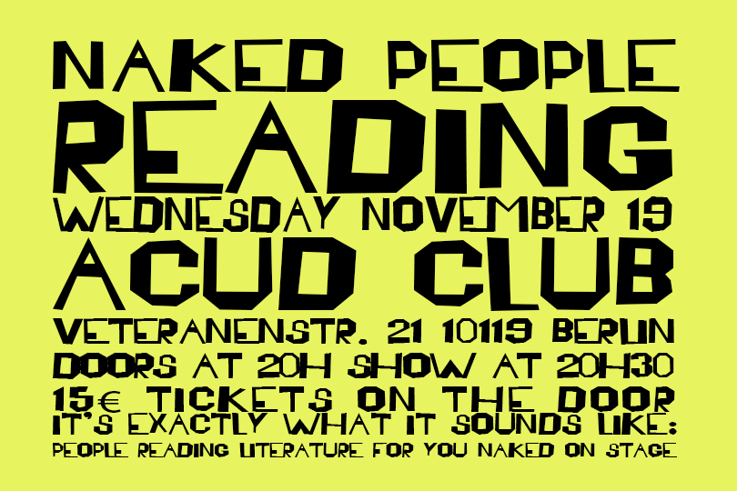 Naked People Reading is exactly what it sounds like-- people reading works of literature naked on stage for your entertainment. A simple, yet radical concept. Join Pansy on Wednesday, November 19th at Acud Club as she hosts a performative literary salon in the nude. The performers have selected their favorite texts on the topic of "Thanks". Doors at 20h, readings from 20h30. Don't worry, you can keep your clothes on...