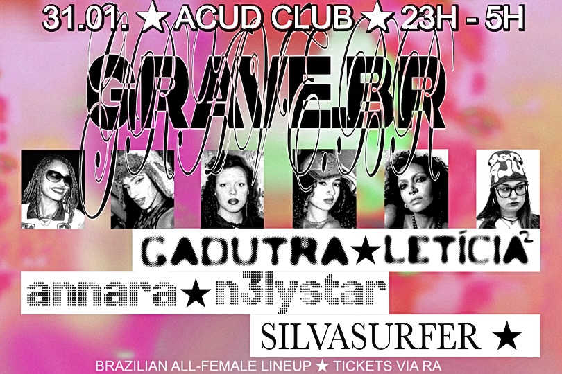 GRAVE BR is honored to present an all-Brazilian and all-female lineup, featuring GADUTRA, ANNARA, N3LYSTAR, LETÍCIA² and SILVASURFER. From different parts of Brazil and now all based in Berlin, the lineup blends distinct references of Baile Funk with elements of Eletronic Music. Expect bass-driven transitions, high-tempo energy, and sets that move between regional references and contemporary club language. This event is built around respect for the music and the people. We do not tolerate racism, sexism, homophobia, transphobia, or any form of discriminatory behavior.