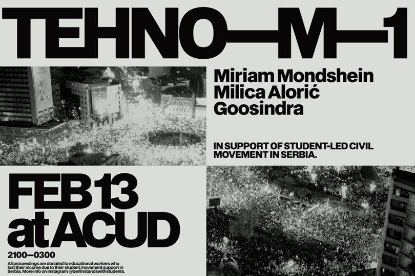 TEHNO|M| is a series of audiovisual tehno events, organized by anyone who identifies with notions Balkan – antifascism – fight against corruption – fight against double standards. The first event, Tehno|M|1, is organized by an informal group of people with roots in the former Yugoslavia and based in Berlin, known as “Berlin Uz Studente”. The collective has been organizing events in Berlin almost since the start of the biggest student movement in Europe since the 60s (the Serbian GenZ Uprising 2024-), with 13 events held so far. All profit from Tehno|M|1 tickets will be donated to support the living costs of educational workers who were collectively dismissed for supporting their students and/or joining the student protests.
